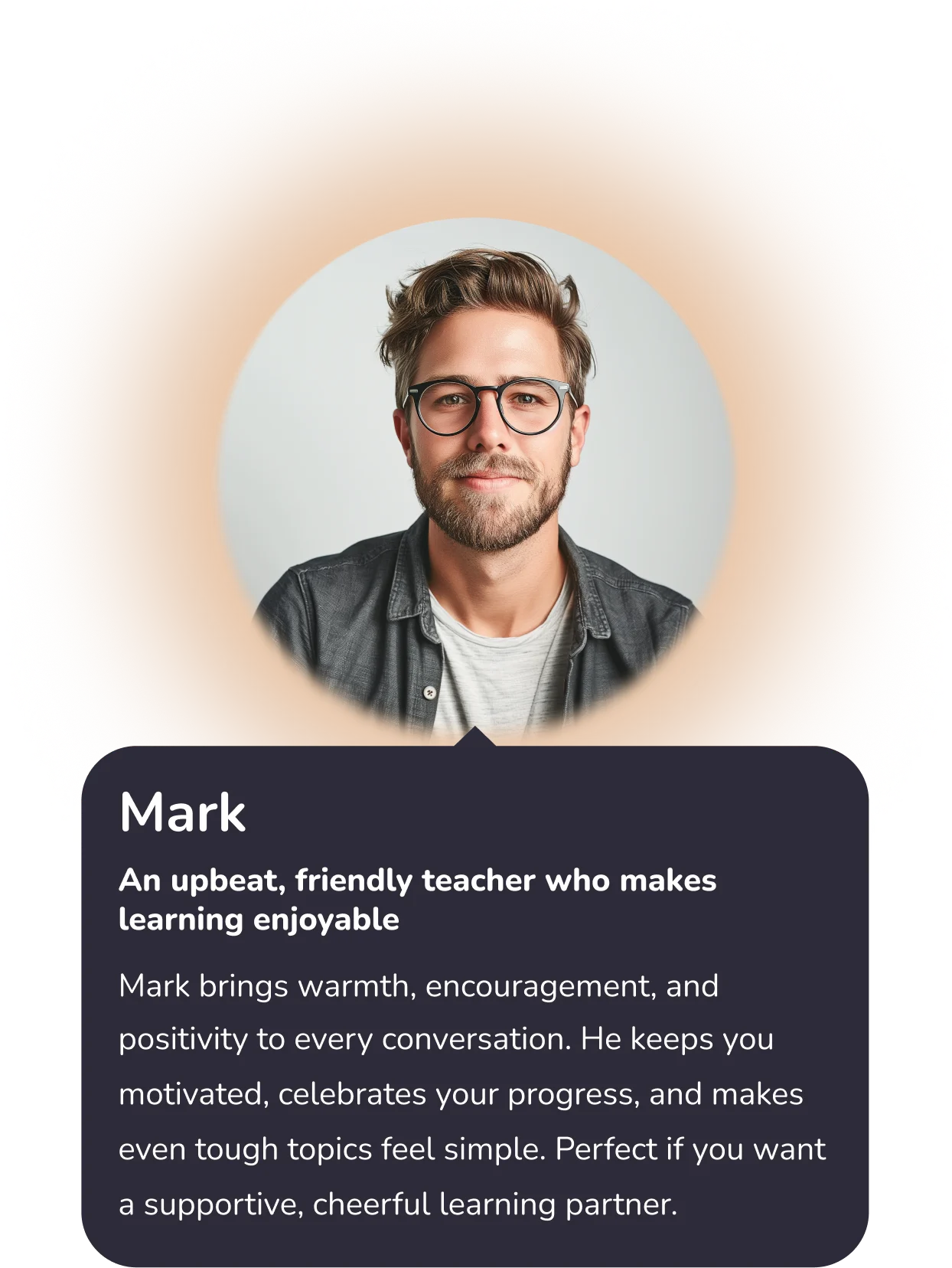 Mark brings warmth, encouragement, and positivity to every conversation. He keeps you motivated, celebrates your progress, and makes even tough topics feel simple. Perfect if you want a supportive, cheerful learning partner.